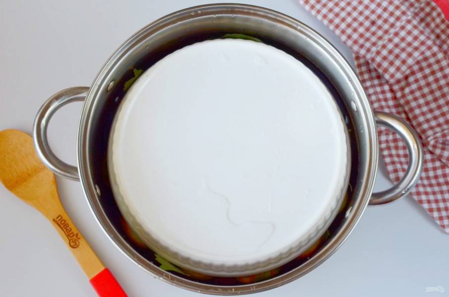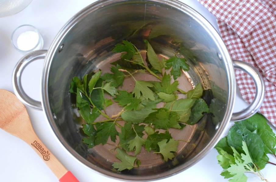 На дно чистой кастрюли (ее можно дополнительно обдать кипятком, чтобы была стерильна) выложите вымытые листья смородины и вишни, часть небольшую оставьте.