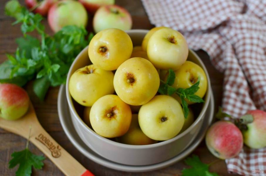 Подготовьте яблоки, воду, сахар и соль, листья вишни и смородины. Яблоки переберите, испорченные и битые не подходят!