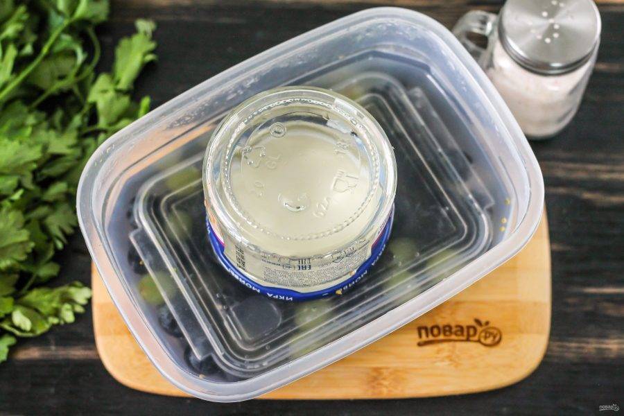 Влейте холодную воду и пермешайте содержимое емкости, растворяя соль. Можно заранее растворить соль в воде и залить виноград и горчицу приготовленным рассолом.