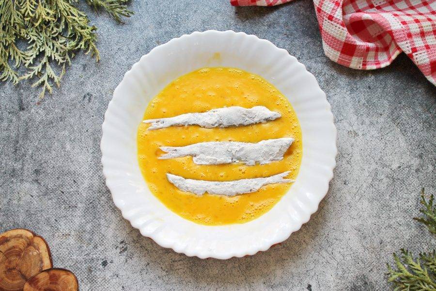 Яйца разбейте в миску, посолите и перемешайте до однородности. Рыбу в муке окуните в яичную массу, чтобы она полностью покрылась.