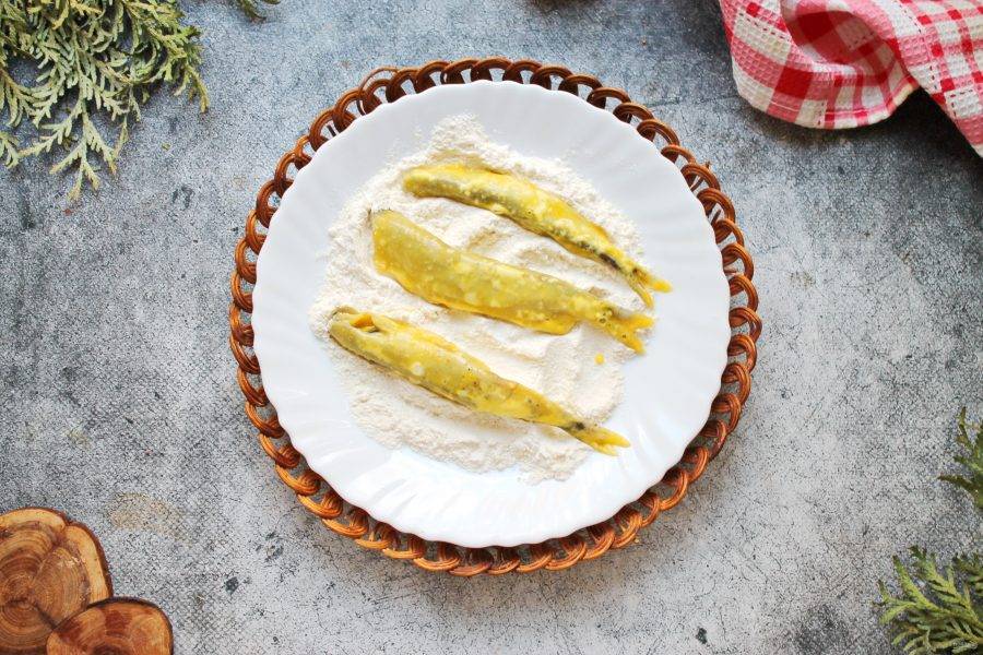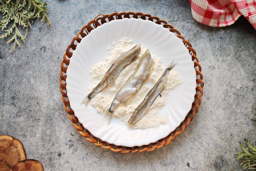 Каждую рыбку полностью запанируйте в муке.
