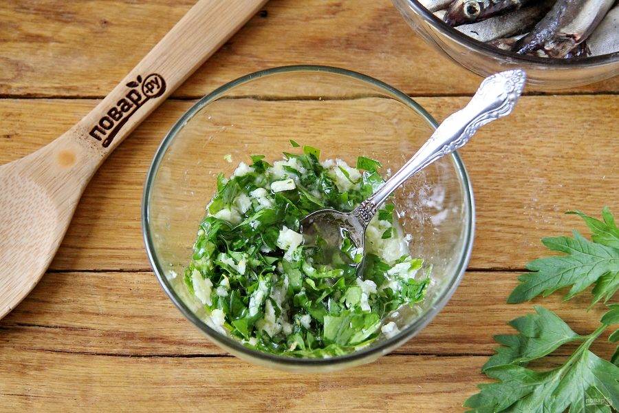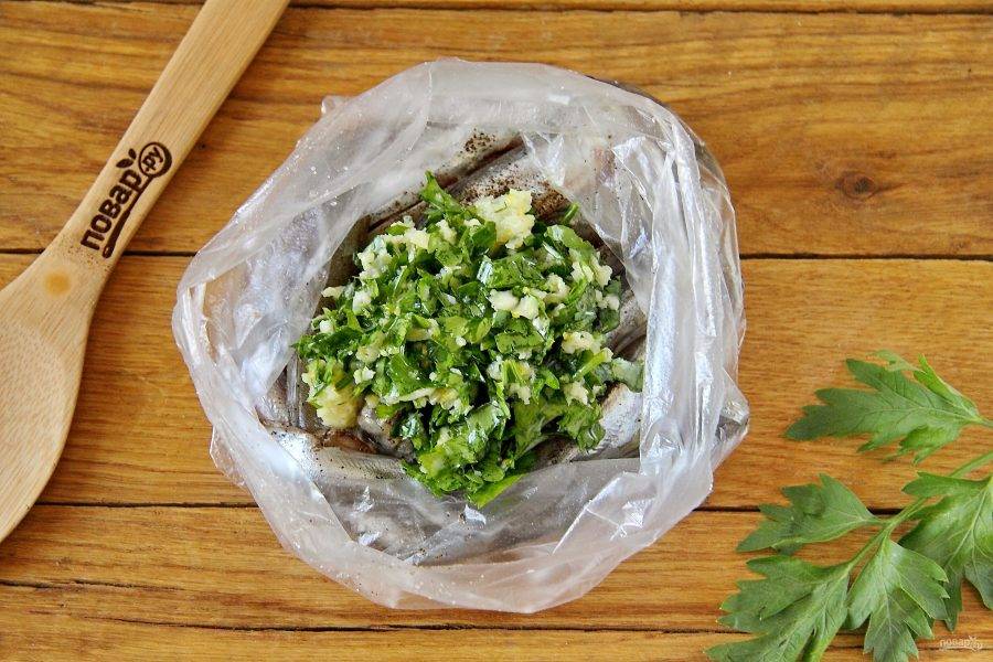 Соедините масло, пропущенный через пресс чеснок, измельченную зелень, цедру и сок лимона.