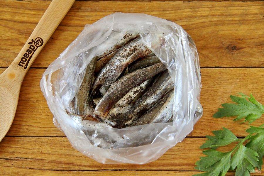 Пакет завяжите и тщательно потрясите руками, чтобы рыба равномерно промариновалась со всех сторон. Оставьте мойву в таком виде на несколько часов, можно оставить на ночь.