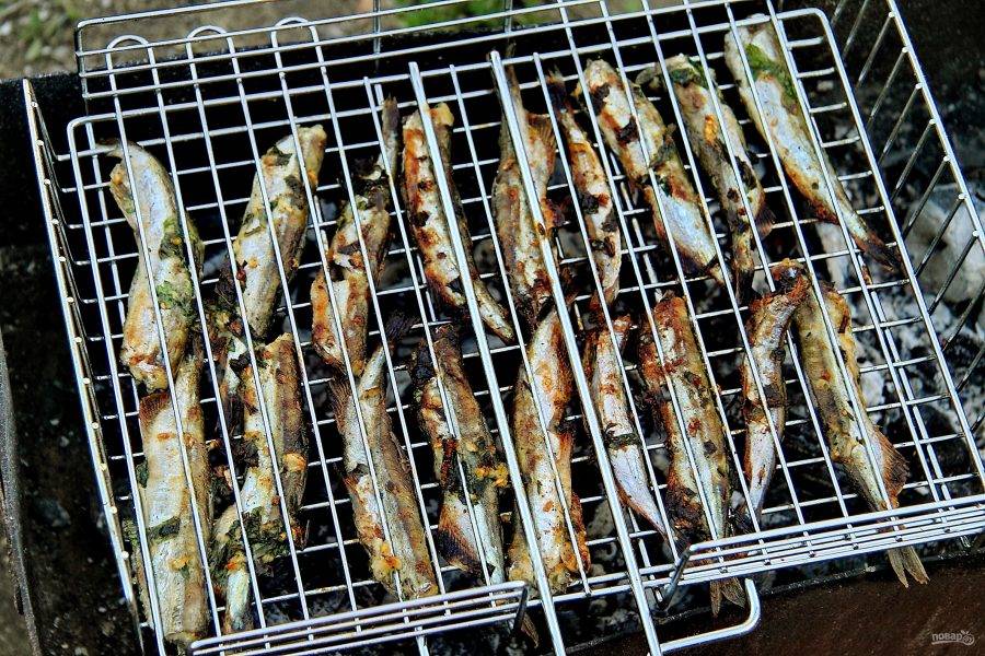 Выложите рыбу на решетку-гриль и жарьте на углях до готовности.
