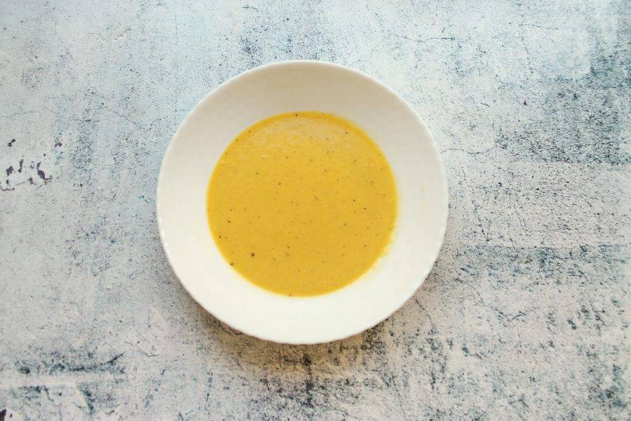 В тарелку разбейте яйцо, добавьте воду, соль, поперчите и перемешайте венчиком до однородности.