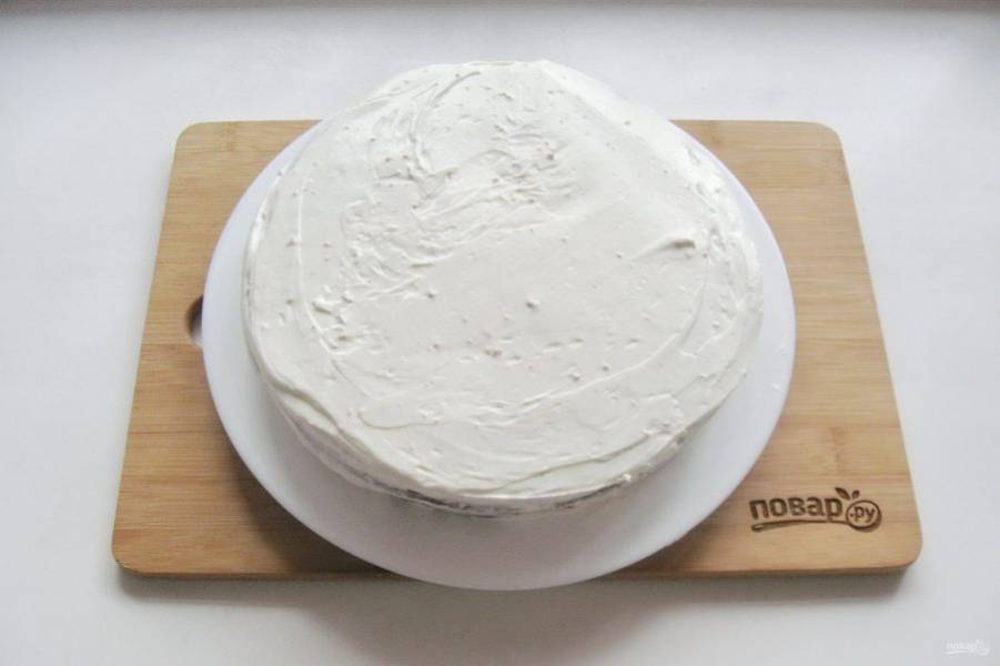 Корж достаньте из формы, остудите и разрежьте на две части вдоль. Прослоите коржи кремом, и смажьте бока торта.