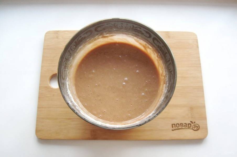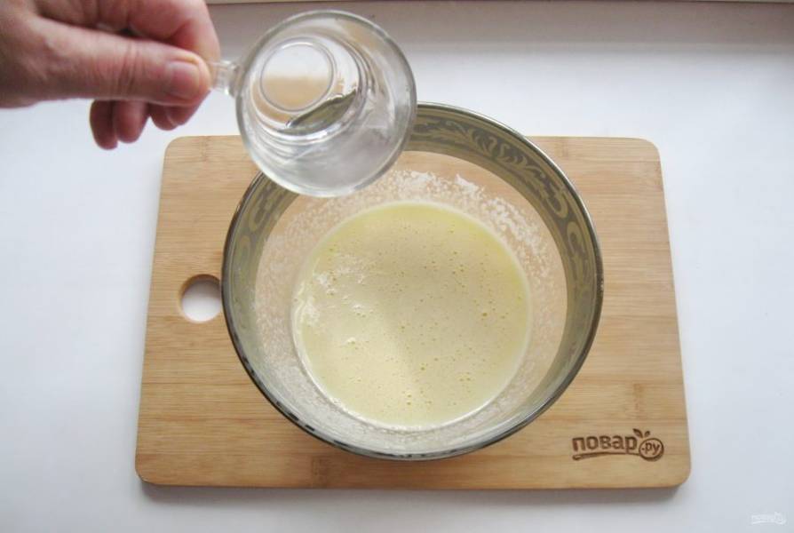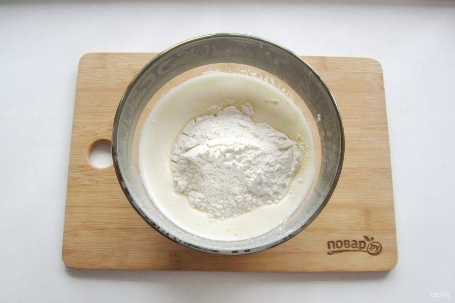 Добавьте соду погашенную уксусом или лимонным соком. Постепенно насыпьте муку и перемешайте венчиком, чтобы не было комочков.