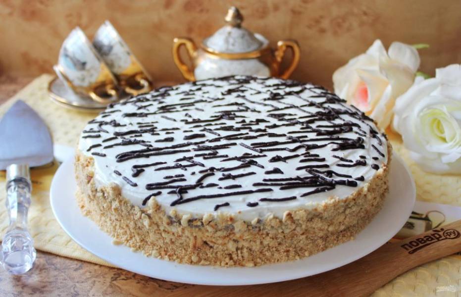 Украсьте торт по вкусу. Я верх торта полила растопленным шоколадом. Бока посыпала измельченным печеньем.