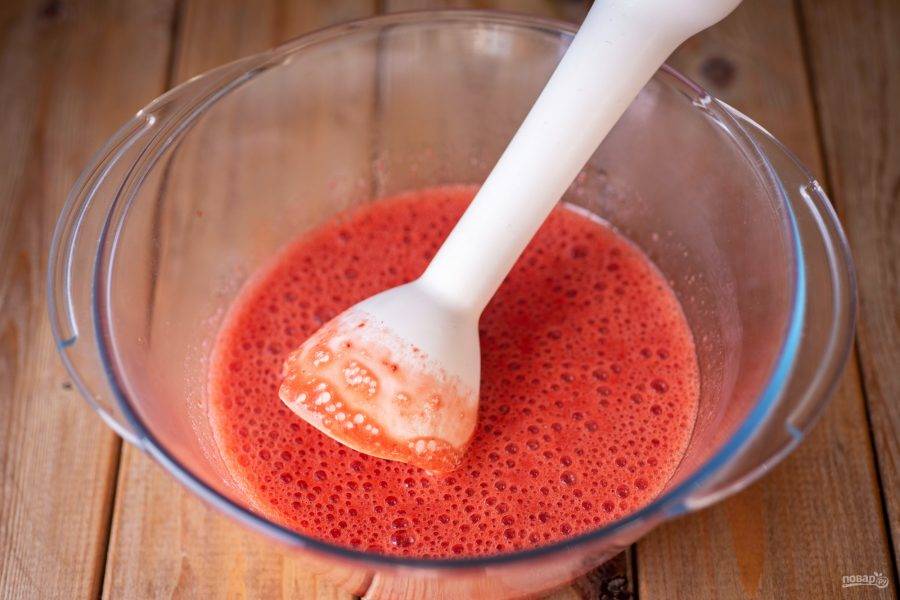 Пробейте все погружным блендером до получения однородного клубничного пюре.