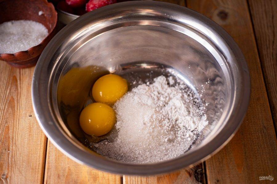 В отдельную миску выложите желтки, добавьте 40 грамм сахара и крахмал.