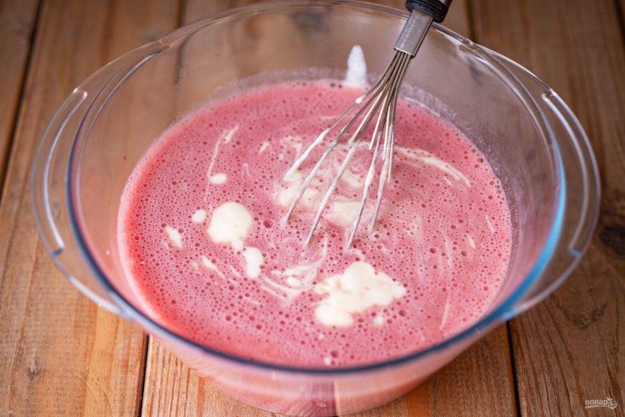 К ягодному пюре добавьте охлажденную молочную смесь. Перемешайте все венчиком.