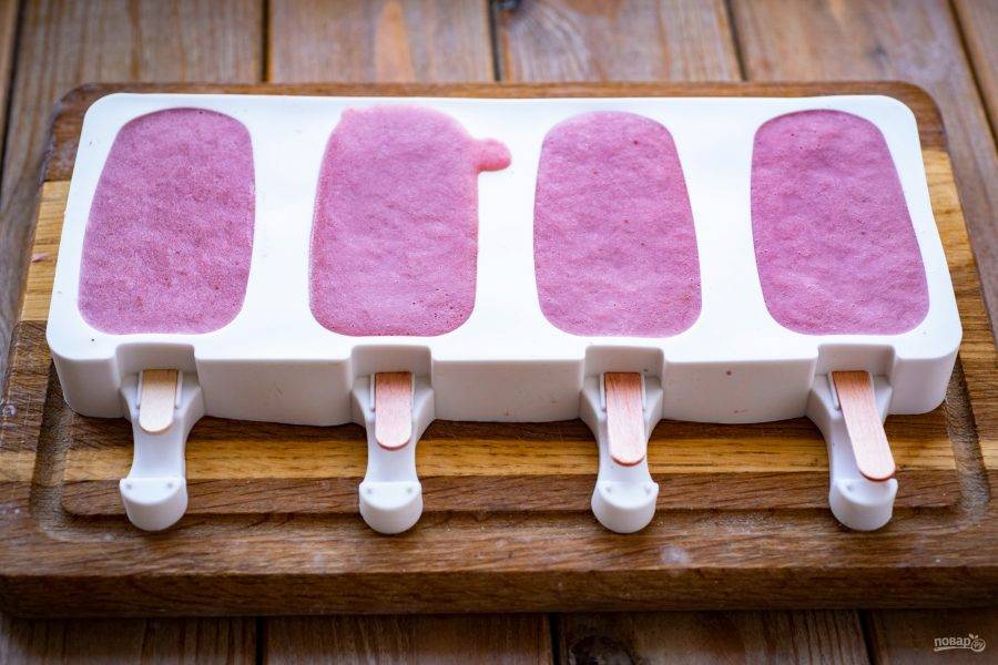 Мороженую смесь разложите по формочкам для мороженого или всю смесь выложите в пищевой контейнер. Отправьте в морозильную камеру примерно на 4 часа замораживаться. Если выложите в контейнер, то надо будет несколько раз во время замораживания пробить смесь погружным блендером, чтобы избежать кристаллизации.