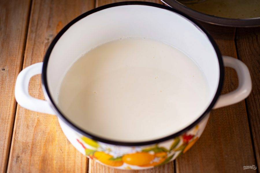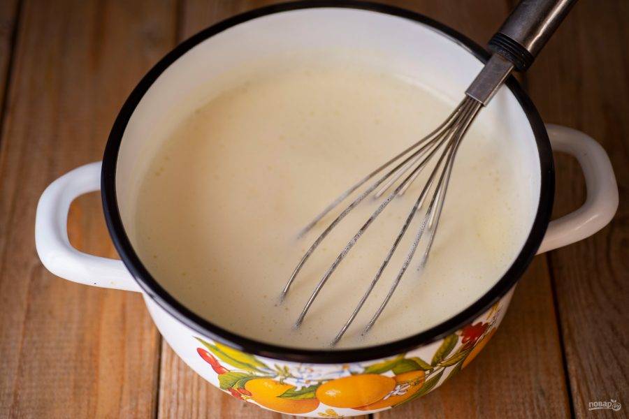 Затем смесь из миски тонкой струйкой залейте в кастрюлю к горячему молоку, при этом активно и постоянно мешайте венчиком, чтобы яичные желтки не успели свернуться. На небольшом огне варите смесь, постоянно помешивая венчиком, до закипания и легкого, но заметного загустевания. Как только смесь станет по консистенции подобна сгущенному молоку, кастрюлю снимайте с плиты. Охладите смесь до комнатной температуры.