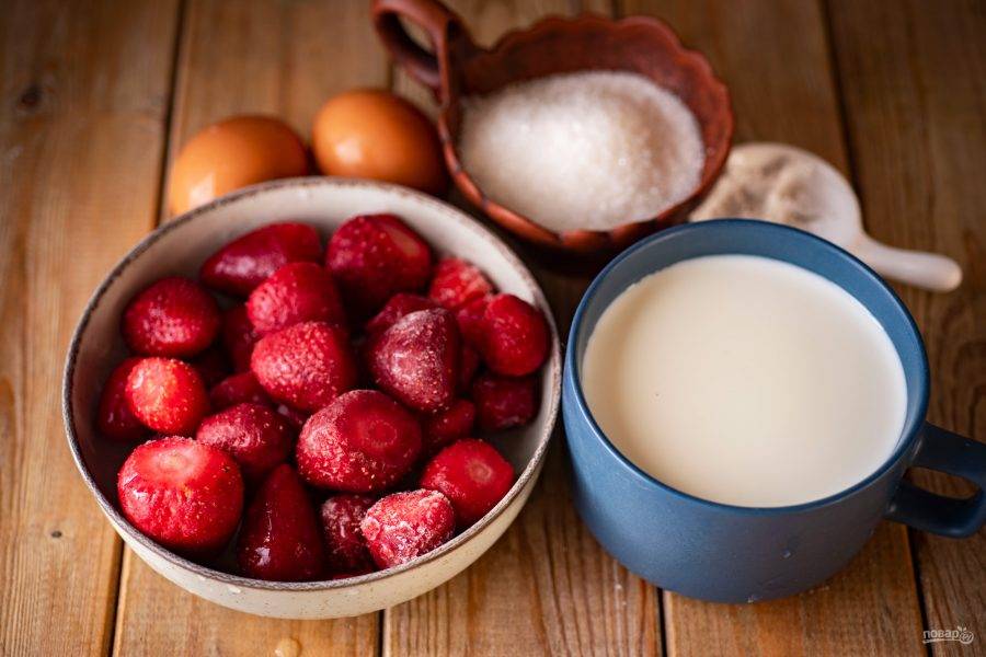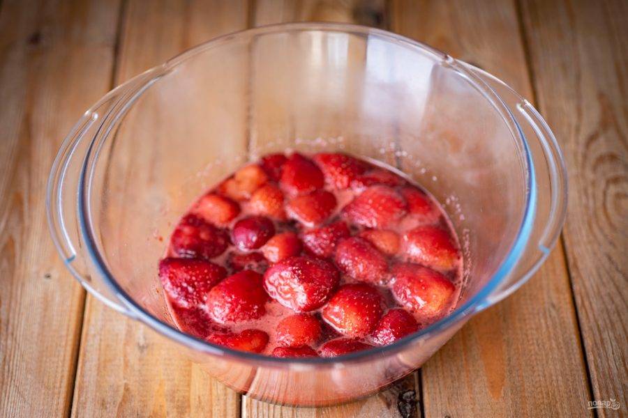 В сотейник выложите замороженную клубнику и добавьте к ней 40 грамм сахара. Поставьте на небольшой огонь и дождитесь закипания сиропа — весь сахар должен раствориться.