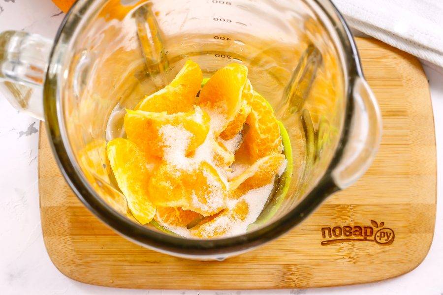 Взбейте все содержимое емкости на пульсирующем режиме в течение 3-4 минут, чтобы все мандариновые дольки измельчились.