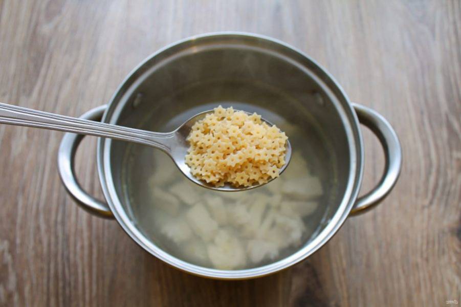 После того как филе сварилось, добавьте макаронные изделия и доведите до кипения.