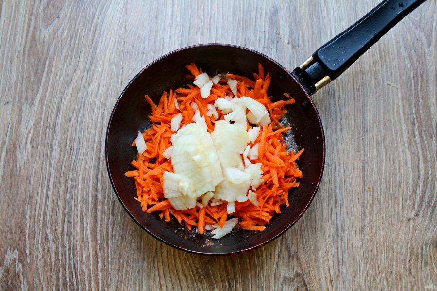 Репчатый лук порежьте и выложите в сковороду с морковью. Обжаривайте в течение 5-7 минут, перемешивая.