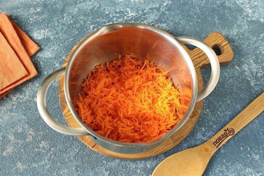 Морковь натрите на мелкой терке и переложите в кастрюлю.