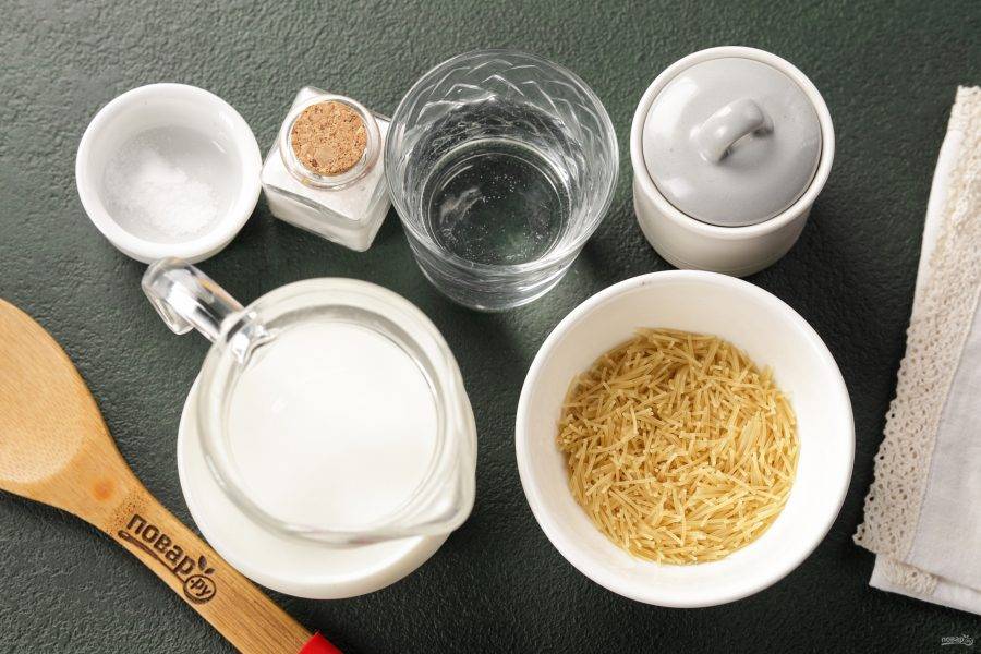 Подготовьте все ингредиенты по списку. Вода добавляется для того, чтобы молоко лучше усваивалось и для снижения его жирности.