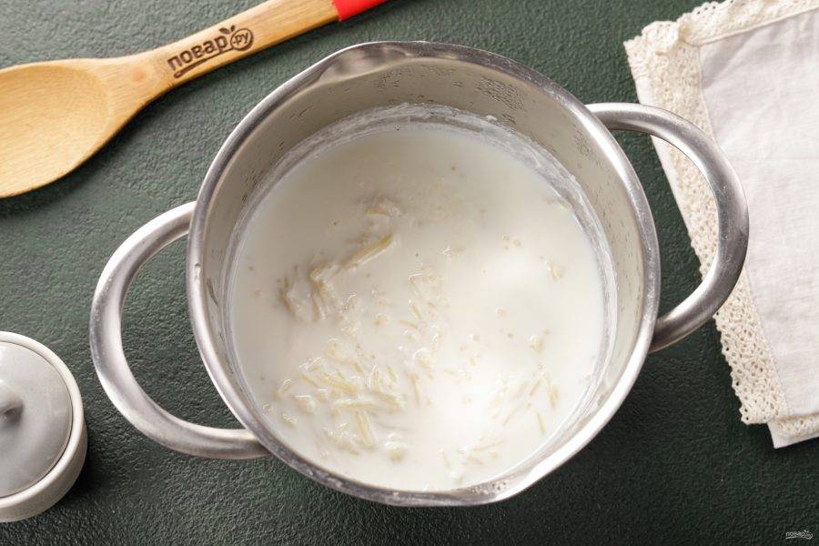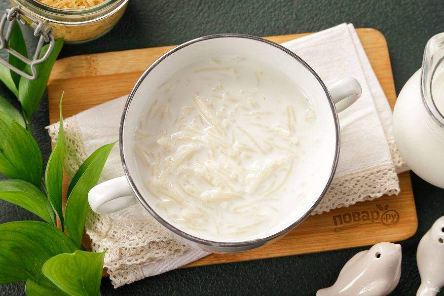 В кипящее молоко выложите мелкую вермишель, перемешайте, чтобы вермишель не слиплась.