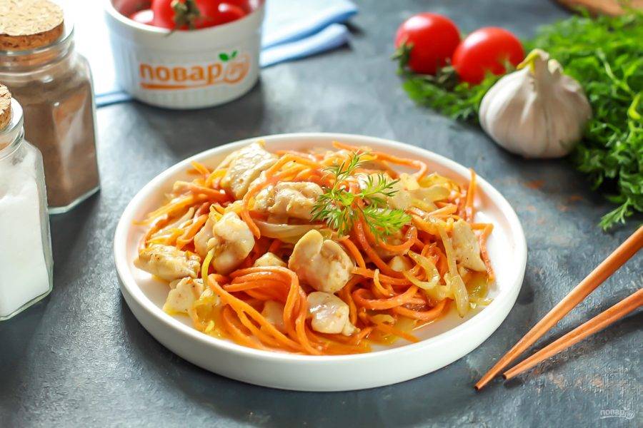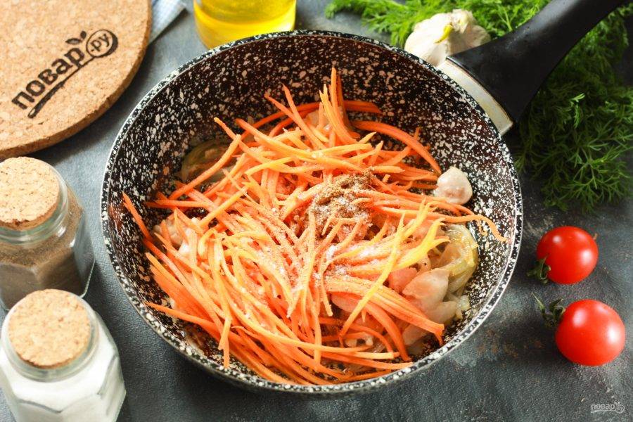 Натрите очищенную морковь на терке для моркови по-корейски и добавьте в сковороду.