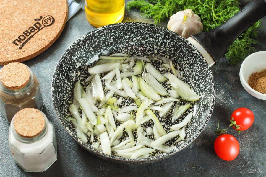 Лук нарежьте полукольцами или лепестками. Прогрейте сковороду с растительным маслом и выложите в нее луковую нарезку. Обжарьте примерно 3 минуты на умеренном нагреве, не забывая перемешивать.