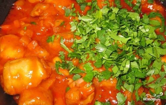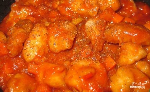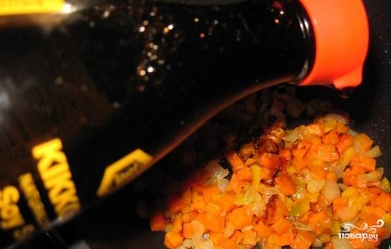 Добавьте к овощам томатную пасту, сахар, соль, соевый соус и воду. Все хорошо перемешайте и тушите еще 15 минут.