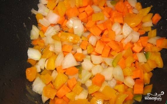 Репчатый лук, морковь и перец нарежьте кубиками и обжаривайте, постоянно помешивая, 5-7 минут.