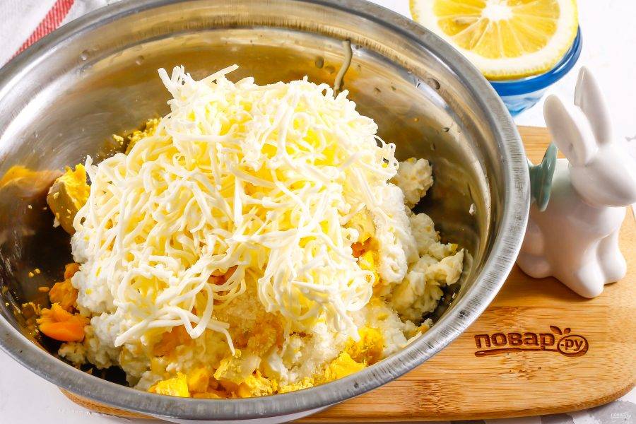 Очистите вареные яйца от скорлупы, промойте в воде и разделите на белки и желтки. Белки используйте для создания другого блюда, желтки натрите в емкость к творогу.