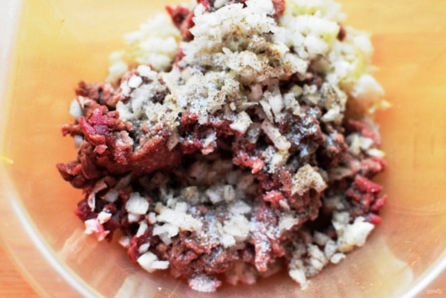 Фарш смешайте с луком, несильно посолите и поперчите. При желании добавьте измельченный зубчик чеснока. Хорошо перемешайте фарш, проминая его руками. Воду в фарш добавлять не стоит, иначе будет трудно формовать буузы.