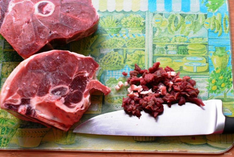 Чтобы удобнее было нарезать фарш мелкими кубиками, мясо возьмите немного подмороженное. Мясо обязательно должно быть жирным, в противном случае добавьте еще и рубленного курдючного жира.