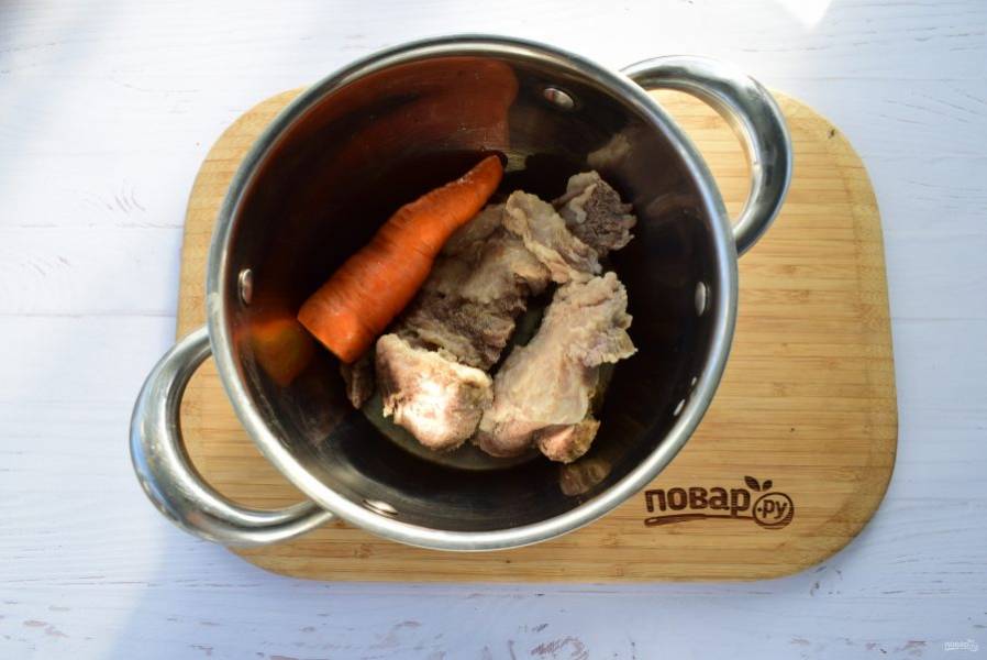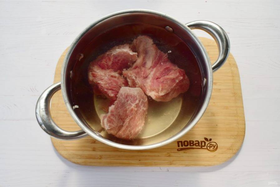 Баранину замочите в холодной воде на 2 часа. Смените воду, доведите до кипения, слейте первый бульон. Залейте чистой водой, варите в течение 2 часов.