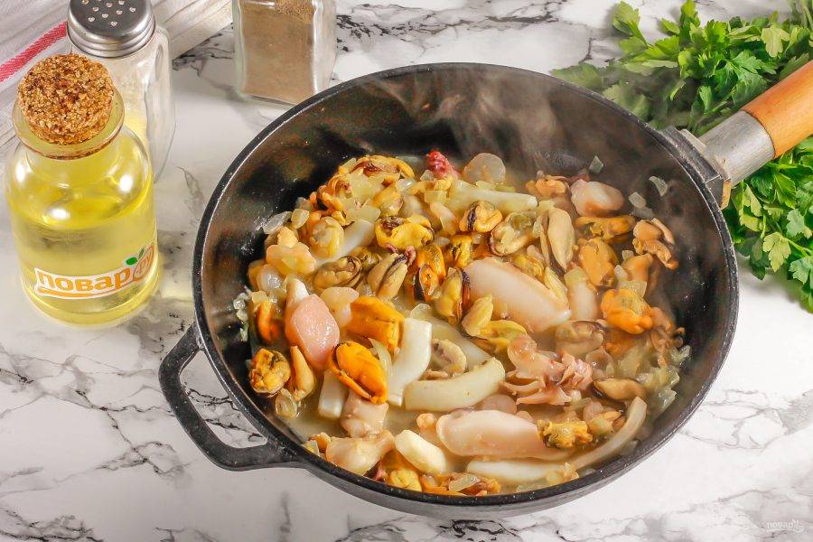 Обжарьте луковую нарезку на сковороде в растительном масле 3-4 минуты. Затем выложите в емкость морской коктейль. После размораживания останется примерно 300 грамм морепродуктов. Потушите примерно 3-4 минуты до готовности, так как морепродукты замораживались отваренными. Воду не добавляйте, жидкость присутствует в морепродуктах.