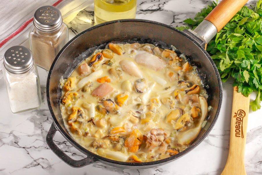 Всыпьте соль и молотый черный перец. По желанию можно добавить другие пряности и специи, не перебивающие вкус морепродуктов.