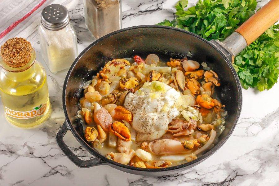 Вкусное блюдо из морепродуктов можно приготовить за пару минут. Для этого вам понадобится замороженный морской коктейль. Главное — покупайте качественную сметану для соуса, чтобы она не свернулась.