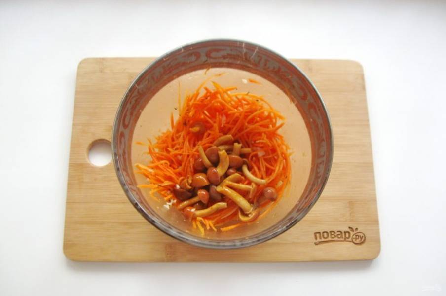 Перемешайте морковь с опятами и поставьте в холод. Через 4 часа блюдо будет готово.