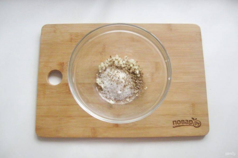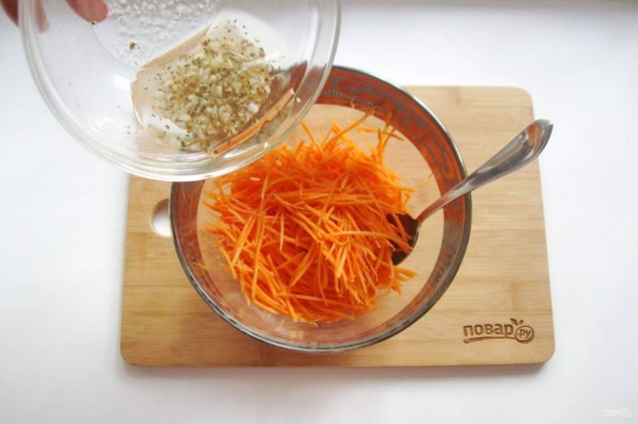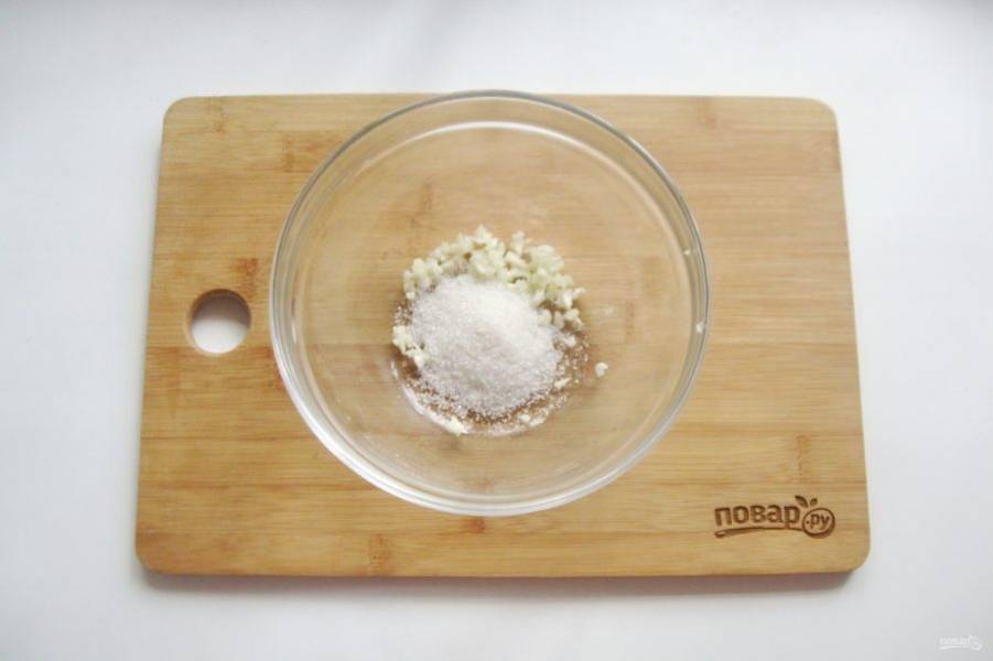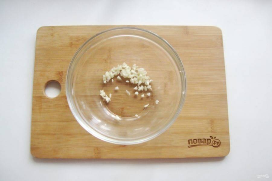 Приготовьте маринад для моркови. Чеснок измельчите и выложите в миску.