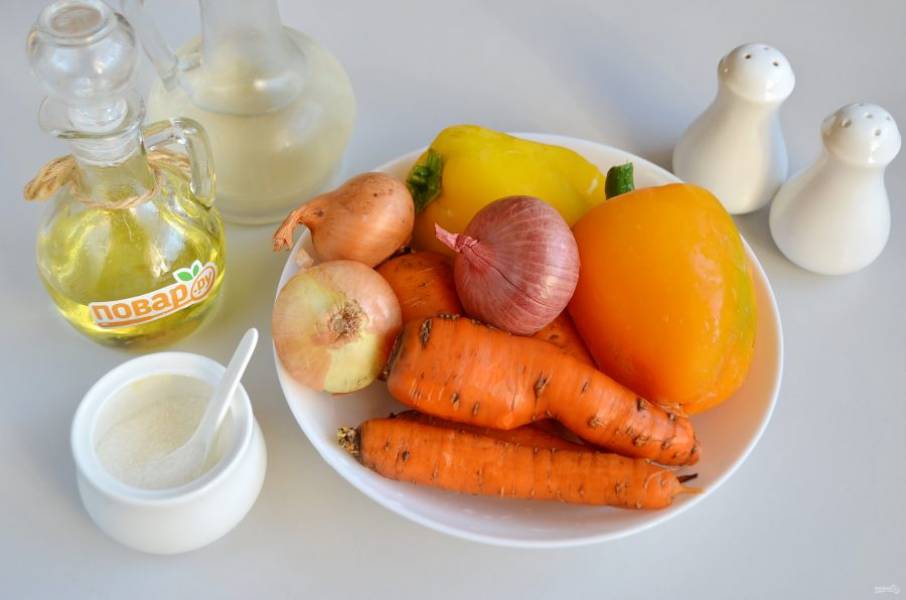 1. Подготовьте необходимые овощи, уксус 6%, соль, сахар и растительное масло. Зелень по желанию. Овощи вымойте, морковь и лук очистите, у перца удалите семена.