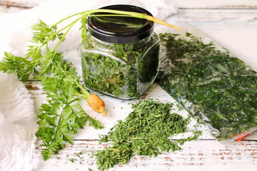 Подготовьте морковную ботву для хранения. Ее нужно перебрать, удаляя черешки, сполоснуть и обсушить.