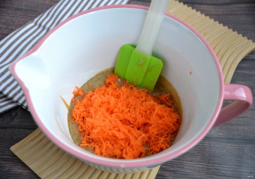 На мелкой терке натрите морковь и добавьте в миску для смешивания.