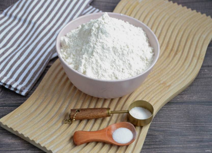 Смешайте муку, соль и разрыхлитель. Всыпьте мучную смесь в миску для смешивания, руками замесите тесто.