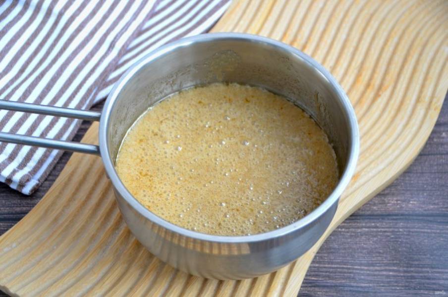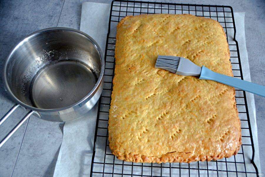Ближе к окончанию выпекания приготовьте насыщенный сироп из 30 гр. воды и 60 гр. сахара. Доведите смесь воды и сахара до кипения и варите примерно 3-5 минут до небольшого загустения.