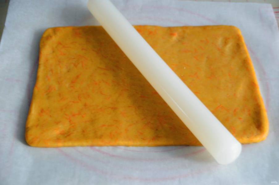 Разделите тесто на 2 части. Раскатайте тесто в пласт. Лучше раскатывать прямо на бумаге для выпечки.