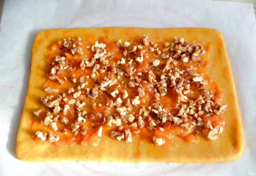 Смажьте тесто джемом, не доходя до краев около 2х сантиметров, посыпьте сверху орехами. У меня джем абрикосовый.