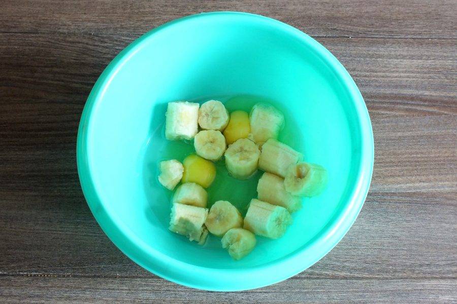 В чаше соедините бананы, яйца и сахар. Пробейте погружным блендером до однородного состояния.