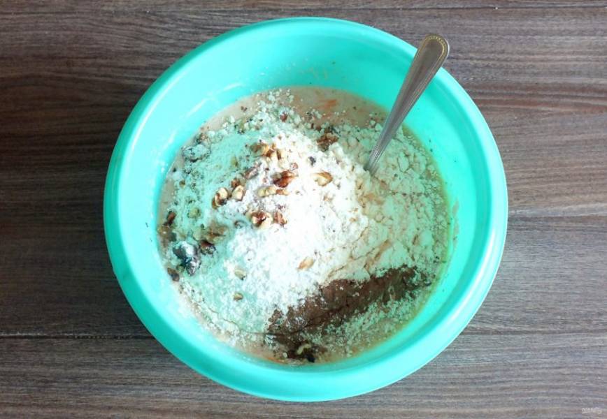 Добавьте просеянную муку, соль, корицу, дробленые орехи и разрыхлитель для теста. Перемешайте тесто ложкой.