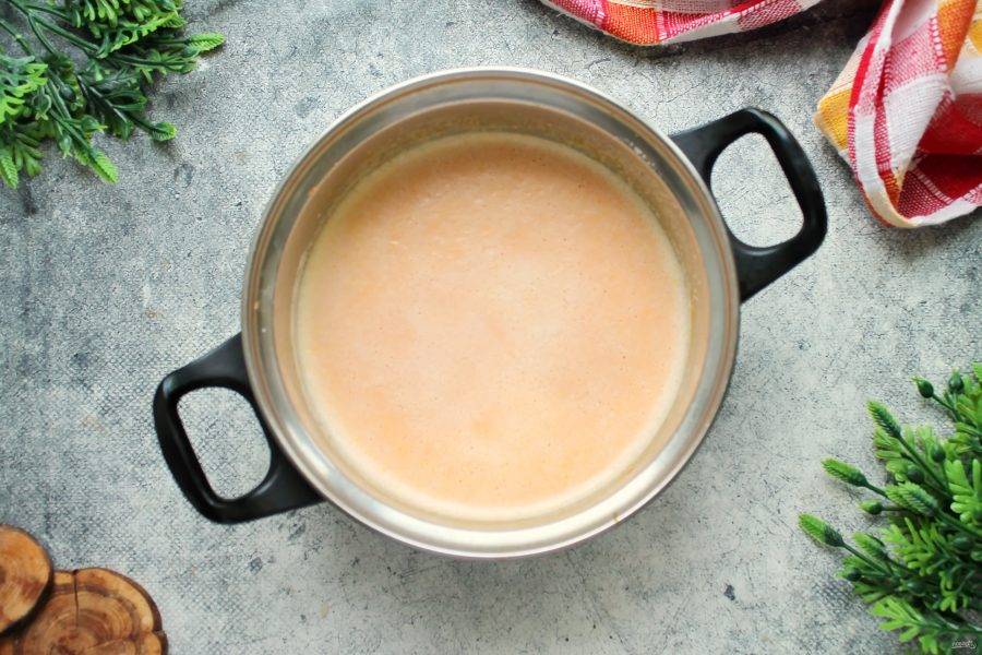 Остудите массу до теплого состояния и пробейте погружным блендером до однородности.