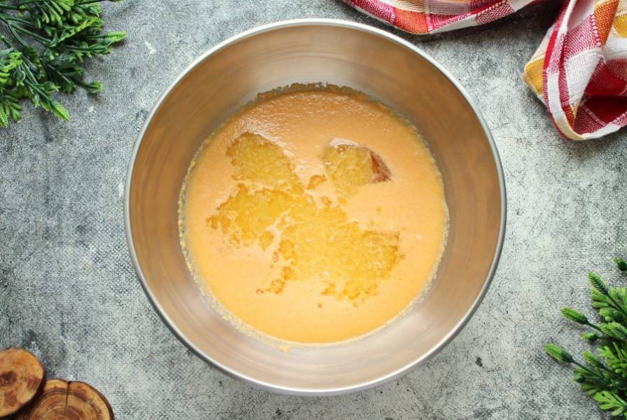 Влейте в миску морковную массу и хорошо перемешайте, чтобы растворились кристаллики и разошлись дрожжи. Разбейте в миску яйцо, перемешайте.