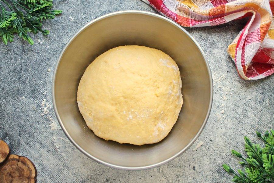 Глубокую миску смажьте растительным маслом и выложите в нее тесто, накройте. Уберите миску в теплое место на 45-60 минут для подъема. Спустя время тесто хорошо поднялось, теперь можно приступать к формированию выпечки.