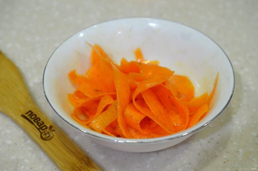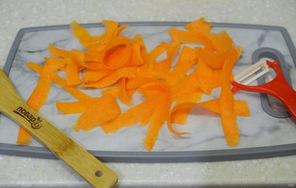 1. Морковь почистите и тонко нарежьте, лучше с помощью овощечистки.